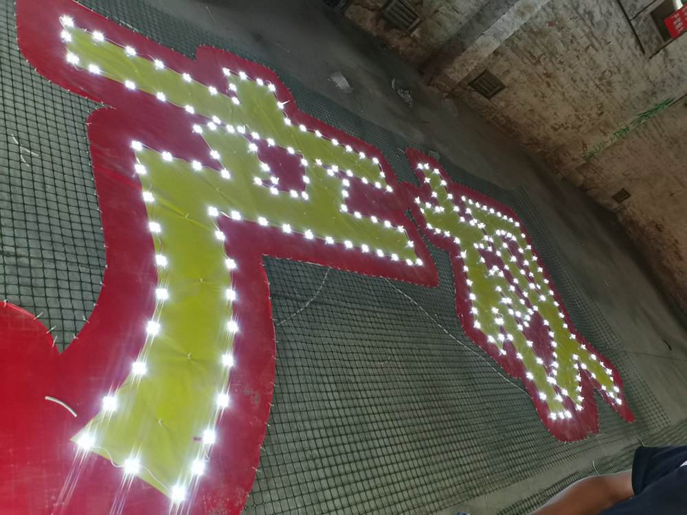 1、光源一般采用led燈條、led燈帶、led模塊燈串等等。單燈固定在噴繪等字形的最外邊,確保字在白天與晚上的大小一致,用扎帶將單燈分別固